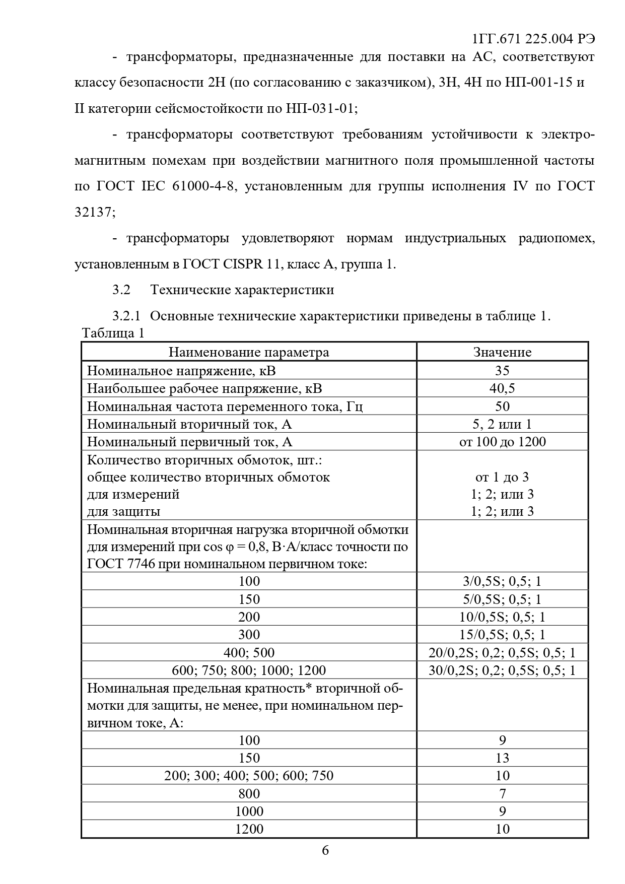Класс напряжения, кВ: 35 Климатическое исполнение: УХЛ1; УХЛ2; Т1; Т2 Номинальный первичный ток, А: 100—1200
