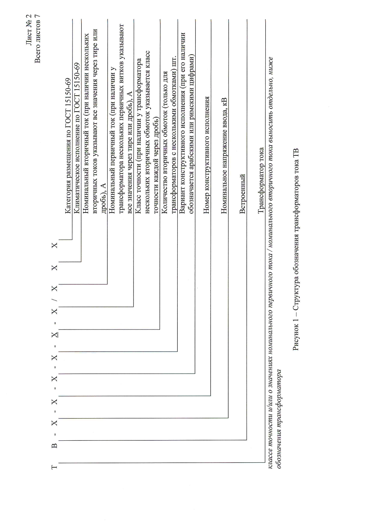 Трансформаторы имеют ряд модификаций, отличающихся классами точности, значениями первичного и вторичного токов, нагрузок, количеством вторичных обмоток, габаритными размерами, массой, наружной изоляцией, вариантами крепления. Структура обозначения трансформаторов приведена на рисунке 1.
